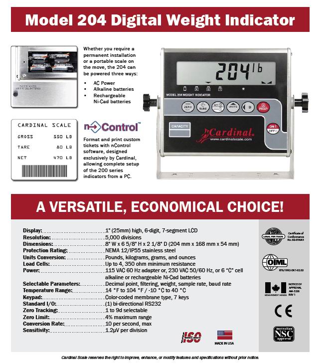 Cardinal 204 稱重顯示儀表(indicator) 規(guī)格: