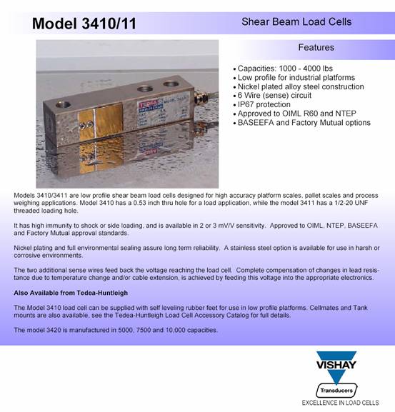 描述:3410是為高精度平臺秤、手推秤、過程稱重設(shè)計(jì)的低截面剪切梁傳感器。抗震動(dòng)或偏載能力強(qiáng),靈敏度2mv/v或3mv/v。通過OIML和NTEP認(rèn)證。在危險(xiǎn)環(huán)境下使用,可以選擇EEX ia IIC T6認(rèn)證的產(chǎn)品。